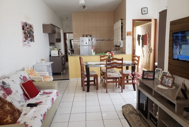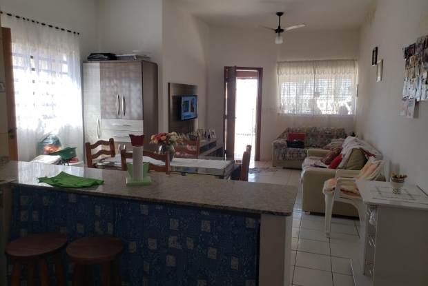 São 02 dormitórios (sendo 01 suíte), Wc social, cozinha americana, sala
